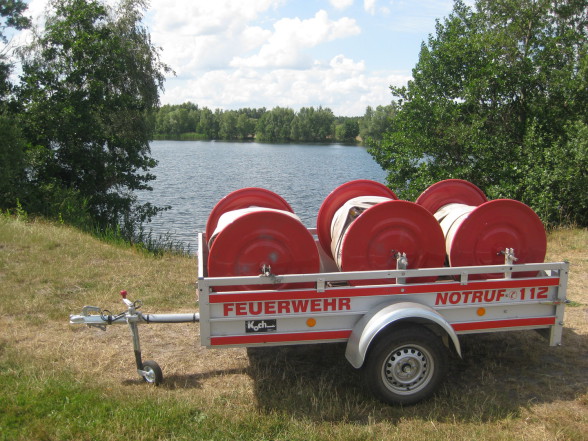 Dieser Schlauchanhänger hat allgemeine Aufmerksamkeit erzeugt. So viel Aufmerksamkeit, dass die FFW Güster in die Kreisfeuerwehr-Bereitschaft „Wasserförderung“ einberufen wurde.